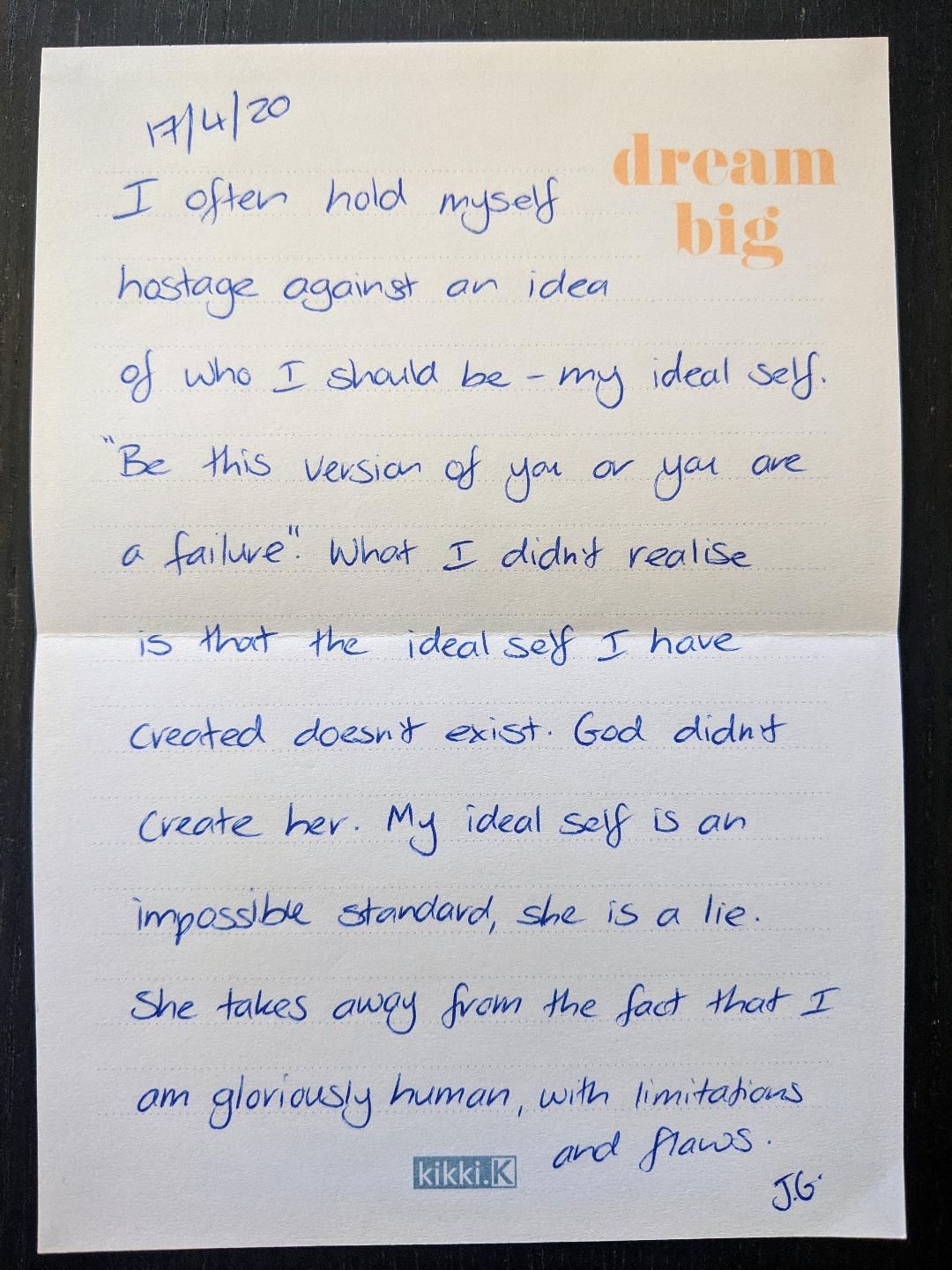 One of my biggest personal struggles is against perfectionism, or perhaps more accurately, comparison to my Ideal self. Ideal Jess is wonderful on paper, so I do understand why I have held onto her for so long. She is gorgeous, very funny, never says the wrong thing, is highly intelligent and articulate but is also still very relatable. Ideal Jess makes everyone else feel at ease as she is at ease within herself. She can also sing, paint and write effortlessly, in fact she is naturally talented at everything. You name it and Ideal Jess can do it, be it, face it and overcome it.