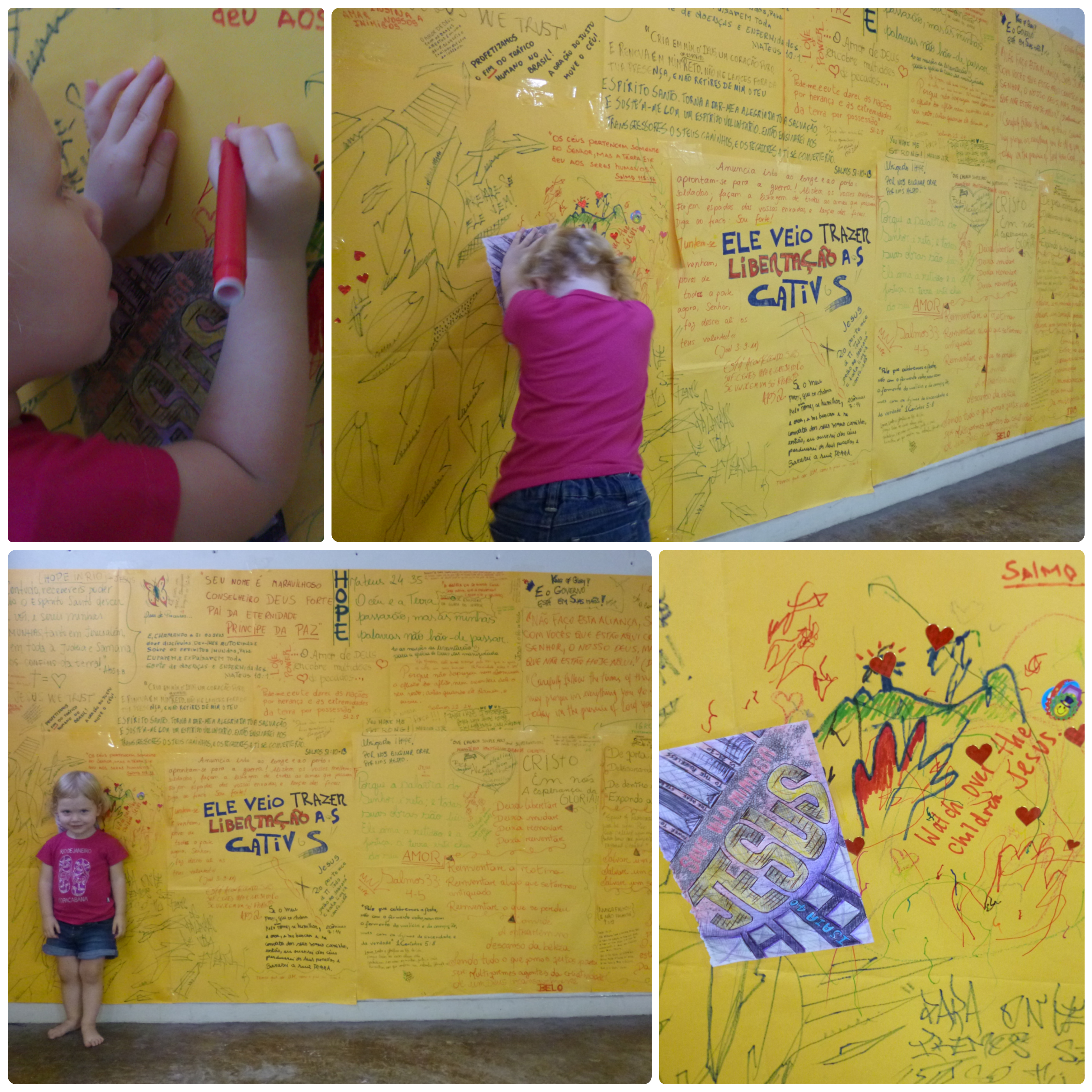 Later, after playing 1-2-3-shoot, Erick and I sat on the floor talking until my Portuguese ran out. I went to get some more paper for us to draw on and grabbed my Brazilian friend Endrew (yes, with an ‘E’) to translate what he could. Erick told me about how his dog had just died, how he could draw a dragon, how he wanted to be a fireman or an astronaut and how he liked coming to the prayer room. He asked me if this place was a church. I said that we weren’t, but that we all loved Jesus. I showed him the prayer wall (I’m not sure what else to call it) and he said he wanted to write something. “What should I write?” he asked. I told him “Write whatever is in your heart”. He wrote Jesus is the best (Jesus e melhor) and you know what, Jesus really is.
